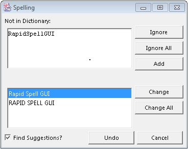 RapidSpellGUIDialog is a JDialog based version of RapidSpellGUI - from here on anything applicable to RapidSpellGUI is also applicable to RapidSpellGUIDialog. RapidSpellGUI is a 100% customisable UI, provides user dictionary functionality, is multi-threaded for slick usability and is extremely simple to use. The interface has a familiar layout and functionality.