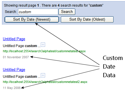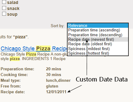 Please see the how-to in the 'Searching an Index' section: ...use CustomData for date sorting