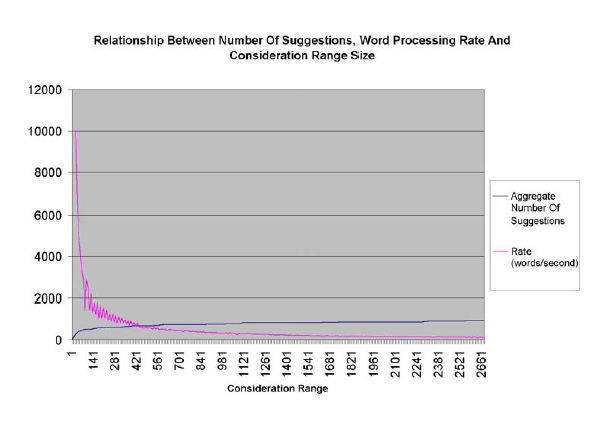 The hashing suggestion algorithm is very fast because it accurately cuts down the list of words to look at as possible suggestions. The factory default consideration range is 80, which provides optimal speed with a loss of only a fraction of possible suggestions. It is possible to set the consideration range through the RapidSpellGUI and RapidSpellChecker classes. The relationship between speed, number of suggestions and consideration range is shown below.